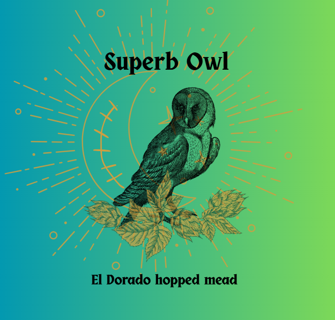 Brewed in honor of the legendary Superb Owl, a nocturnal guardian said to watch over revelers and travelers alike. This crisp dry‑hopped mead is crafted from light honey fermented to a clean finish, then dry‑hopped generously with El Dorado hops, known for their bright notes of pineapple, stone fruit, and citrus.